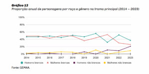 De acordo com o GEMAA, entre 1977 e 2023, 86,4% dos personagens da TV Globo foram brancos, enquanto apenas 12,9% eram pretos ou pardos. A sub-representação se agrava quando o recorte é de gênero: personagens masculinos brancos seguem como maioria absoluta, e as mulheres negras, embora em crescimento, continuam a ser as mais invisibilizadas.