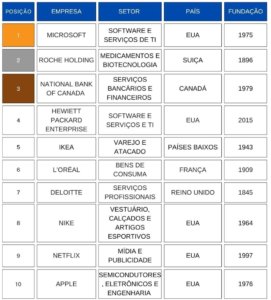 A segunda colocação é ocupada pela farmacêutica Roche Holding, seguida pelo National Bank of Canada, no terceiro lugar. Hewlett Packard Enterprise e IKEA completam o top 5.